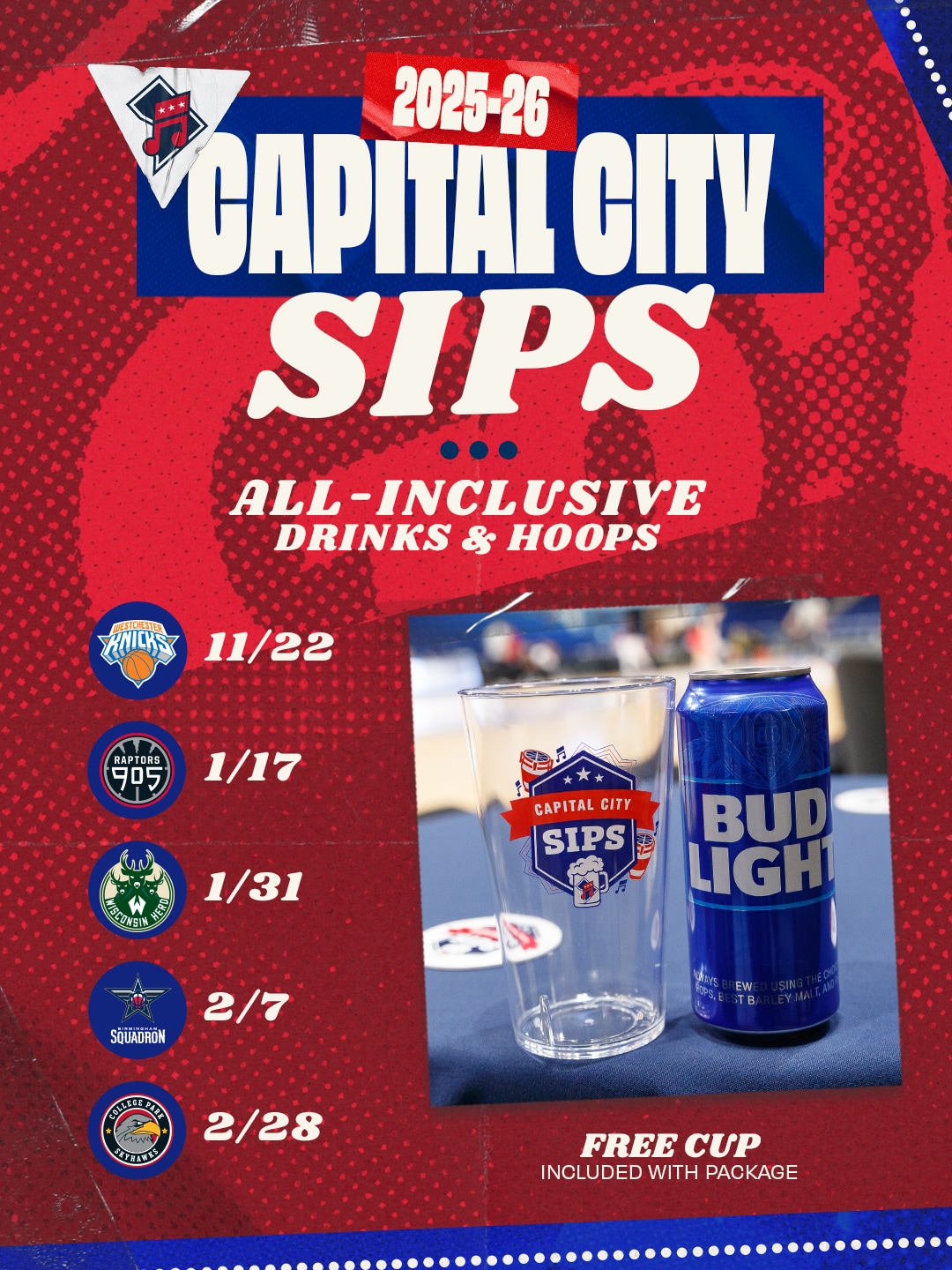 Sip Series games feature local go-go bands performing courtside and our all-inclusive beer & wine ticket package. Each ticket package includes a game ticket, all-inclusive Beer & Wine*, and a Capital City Go-Go Sips Cup.