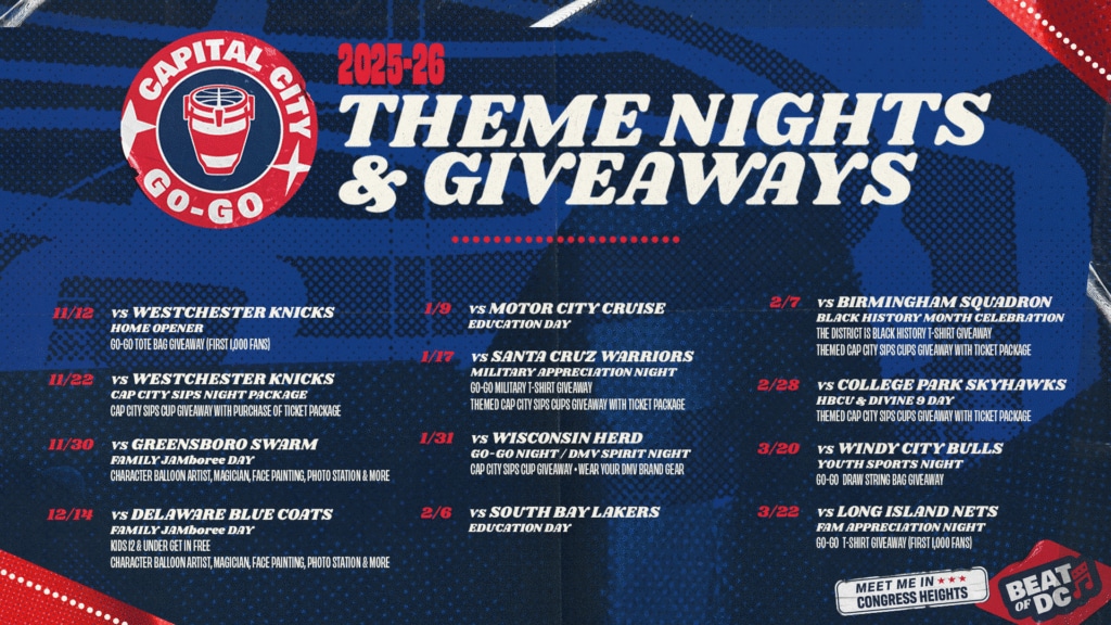 Go-Go & DMV Spirit Night: Jan. 31 - It’s Go-Go and DMV Spirit Night. Show up and show your DMV pride while enjoying a full night of Go-Go entertainment and D.C. basketball. It’s also Saturday night in the District! Fans will have the ability to purchase a Sips Package that comes with an additional themed Capital City Sips Cup, all-inclusive beer, wine, and snacks.